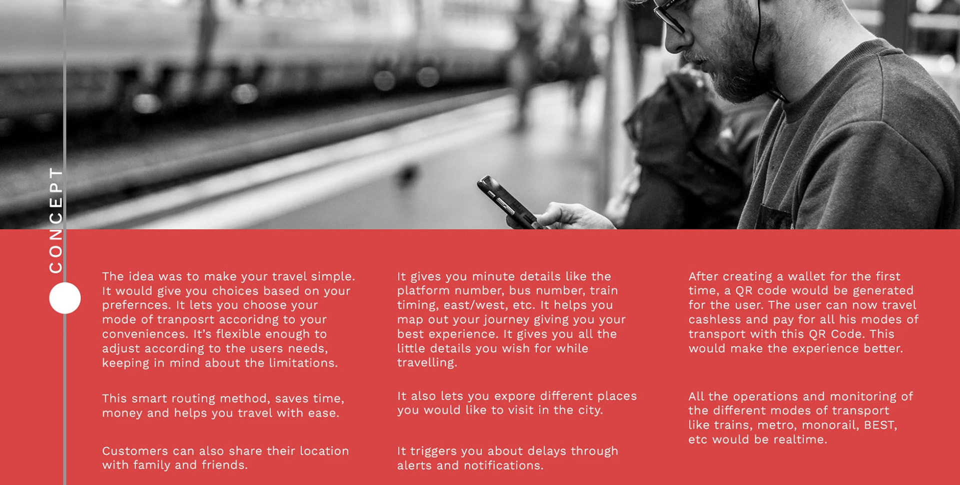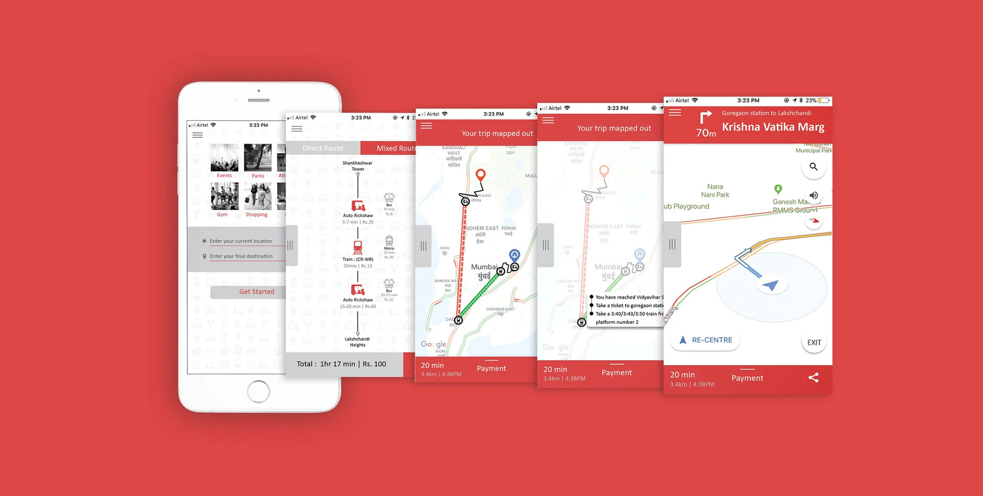 The idea behind this project was to make travel simple and convenient for the regular commuters in a metro city like Mumbai. "Out and about" is an app based solution that lets one choose a mode of transport for a preferred route and gives all the necessary information that a commuter requires.